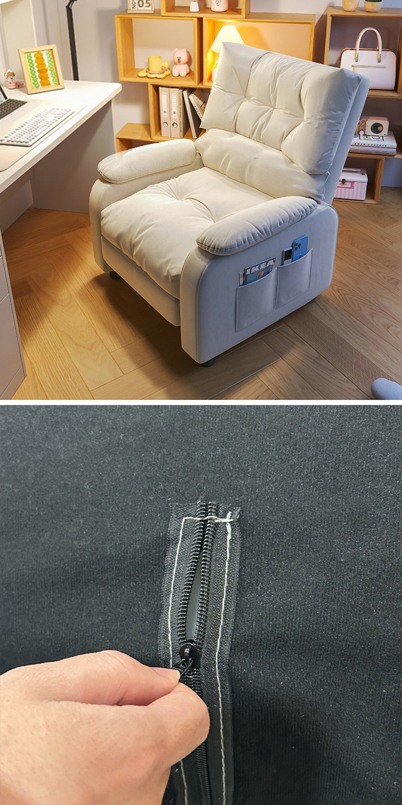 また、背もたれの角度は多段階で調整可能であり、好みに合わせて快適な座り方を選択できます。さらに、チェアカバーは取り外し可能で、お手入れが簡単です。