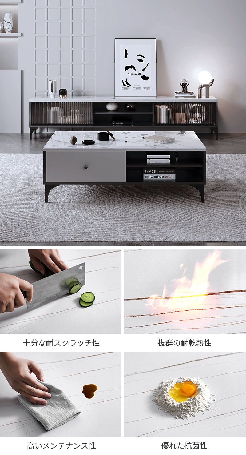 [天板 ]高級シントレードストーン(セラミックの一種) [ボディ]HDF高密度繊維板 [扉]ガラス [脚]金属