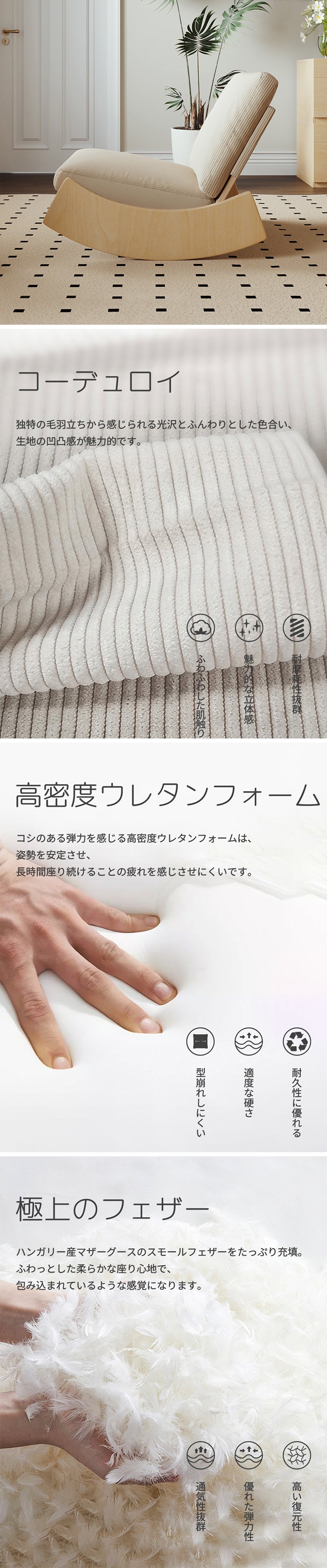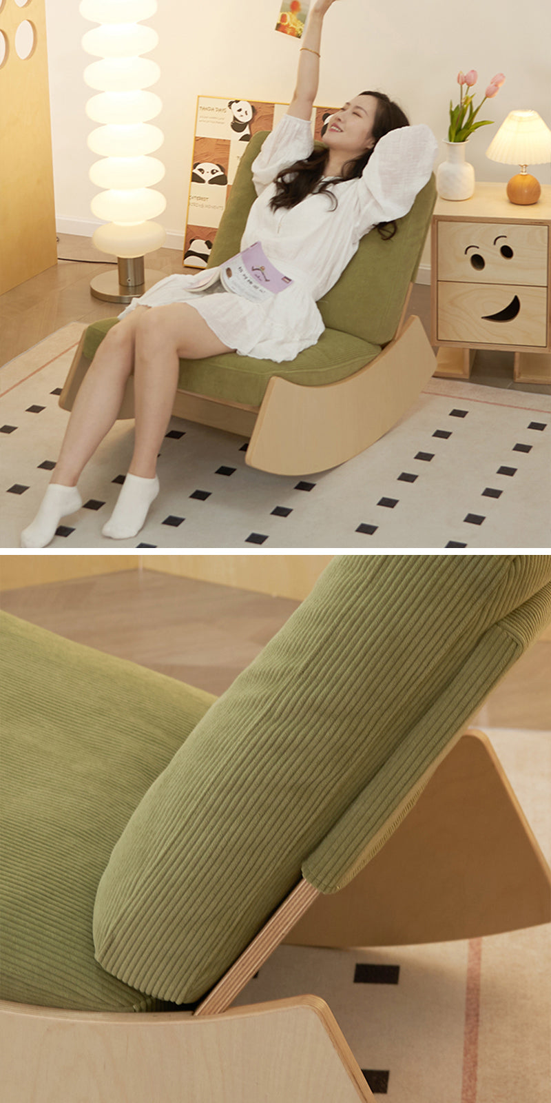 チェアのデザインはのんびりと揺れることができ、座ってリフレッシュしながら、心身をリラックスさせる感覚を提供します。