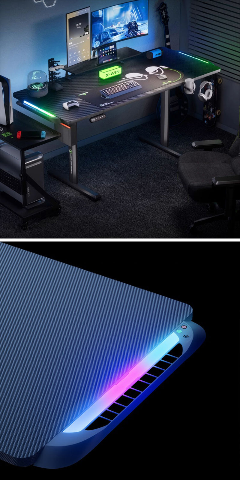 モダンでスタイリッシュなデザインが特徴的なデスクです。ブラックの天板とメタリックな脚部が、洗練された印象を与えます。特にゲーミングデスクとしての機能性を重視したデザインで、天板にはカーボンファイバー風のテクスチャーが施され、耐久性と美しさを兼ね備えています。