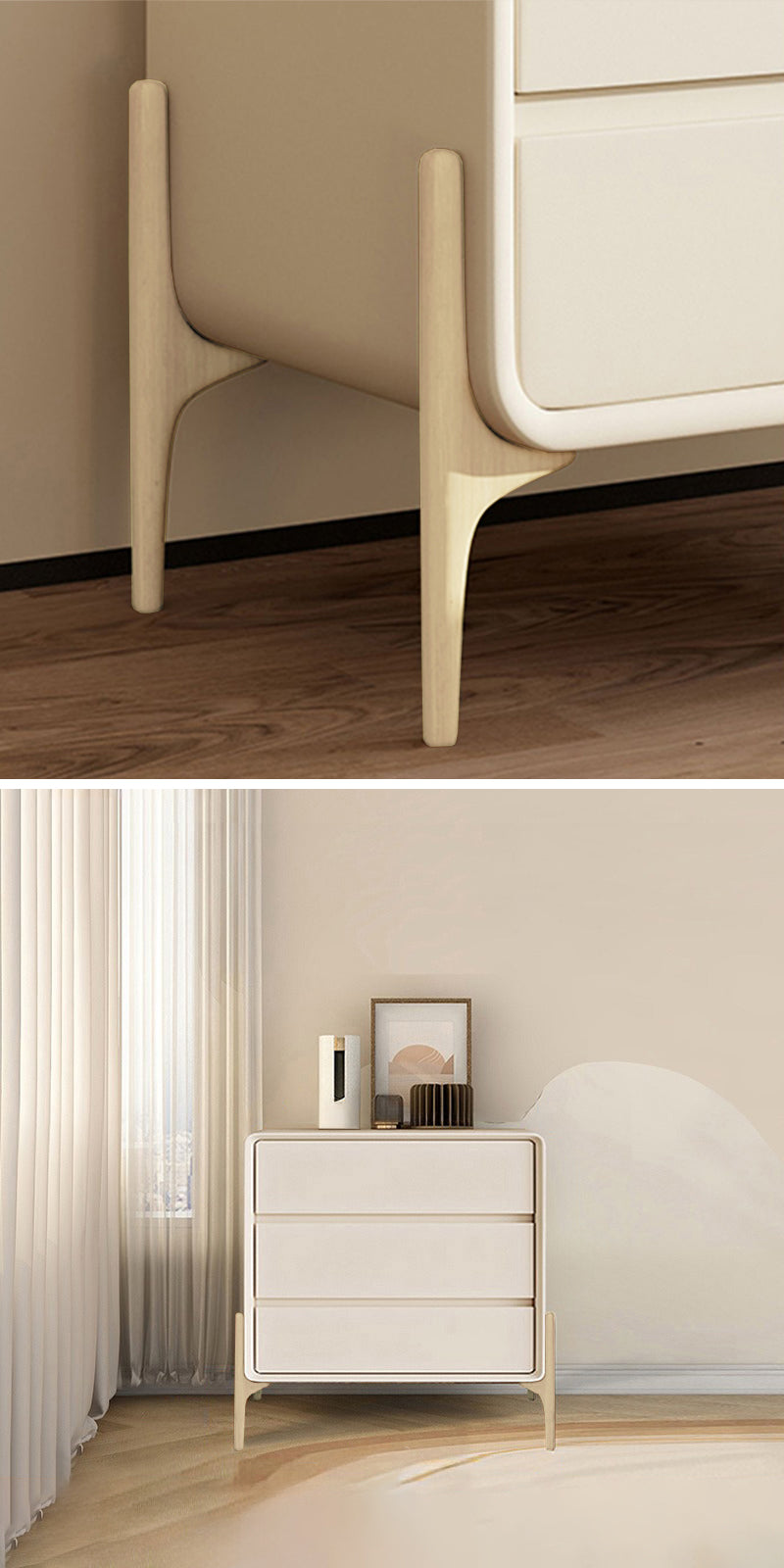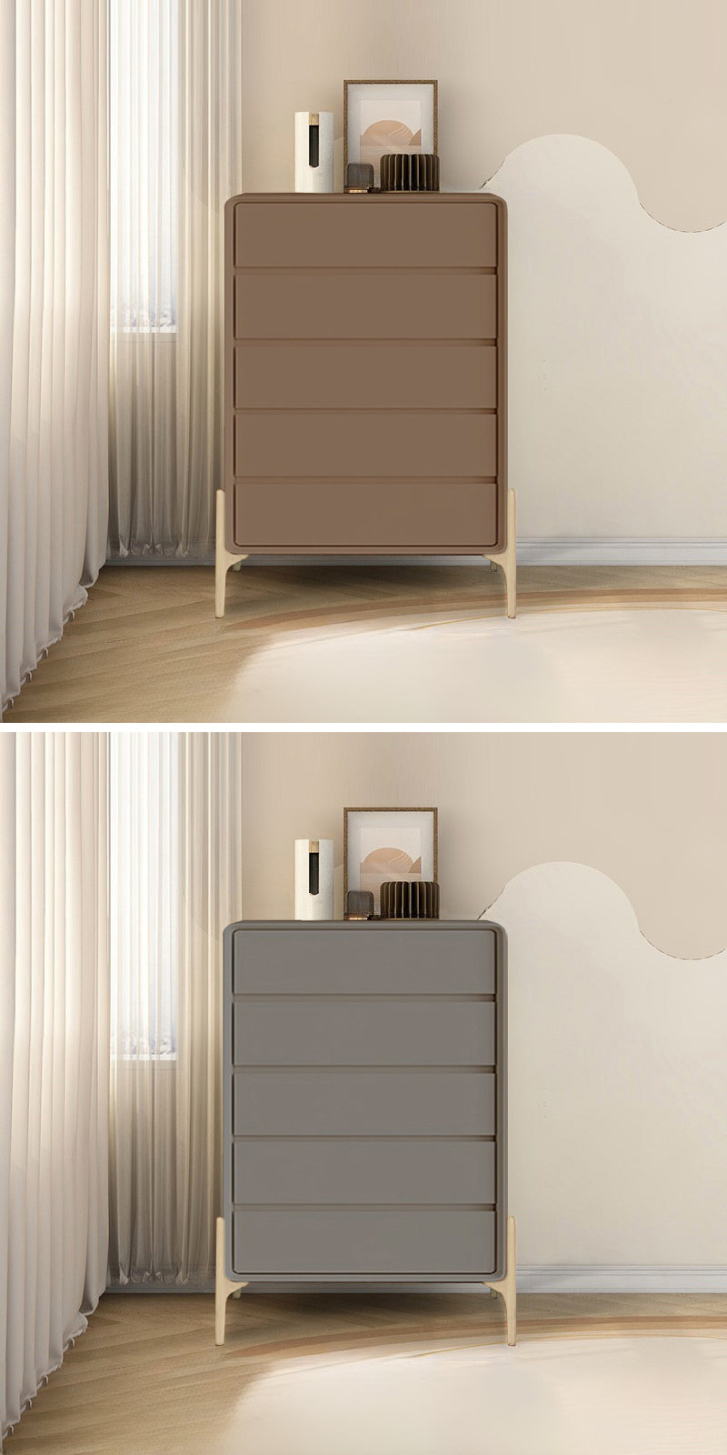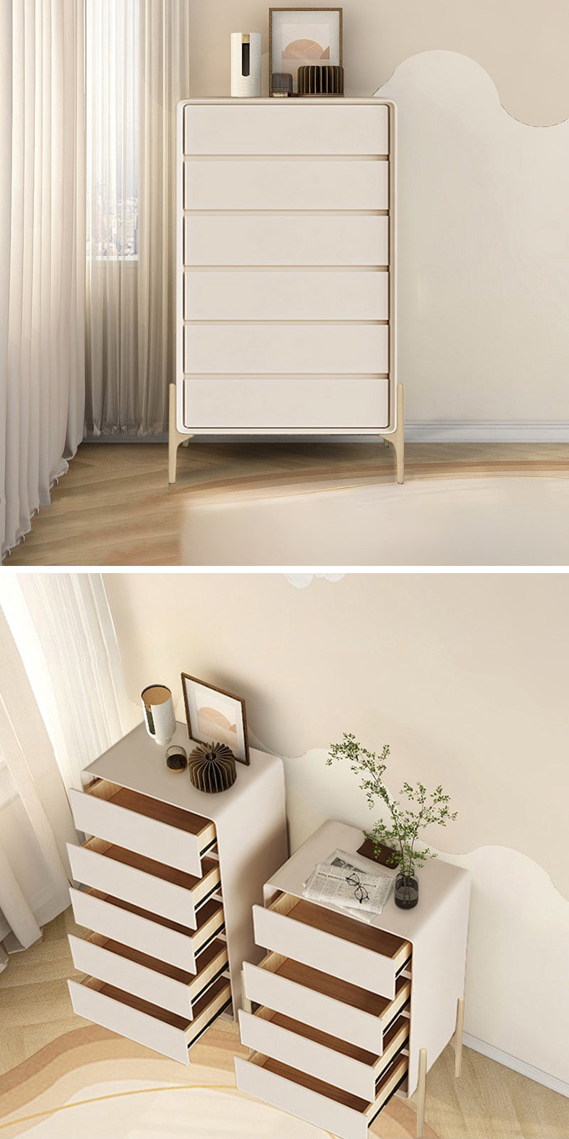 モダンな直線と柔らかな曲線が融合したデザインで、部屋全体にエレガントで落ち着いた雰囲気を与えます。キャビネットは3段式から6段式までのサイズがあり、収納ニーズに応じて選択できます。