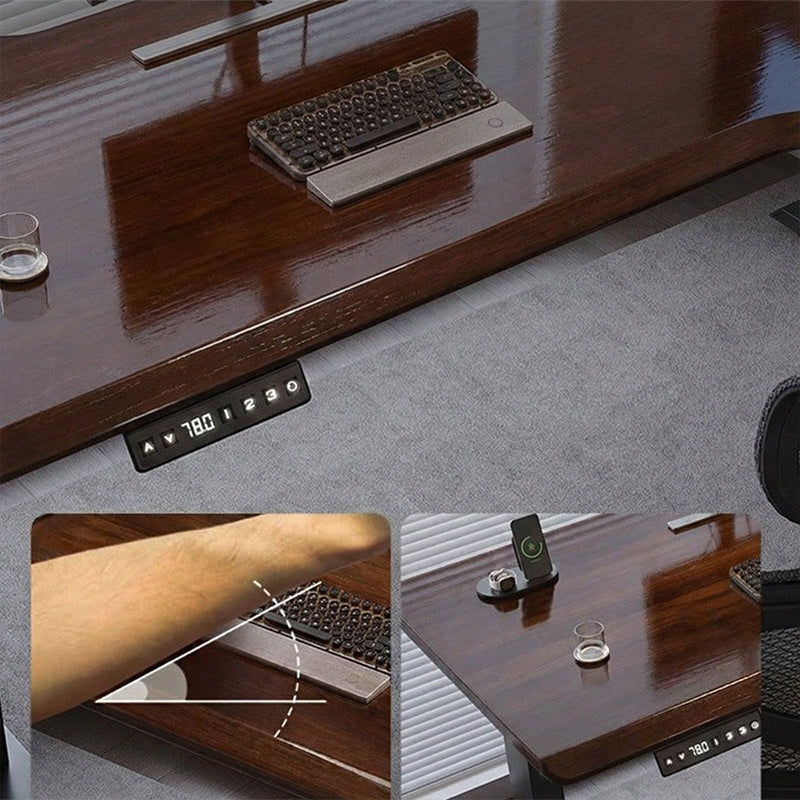 デスクの天板にはMDF中密度繊維板を採用しており、耐久性に優れ、長期間の使用でも美しい外観を保ちます。脚部は頑丈な金属製で、安定感があり、高さ調整がスムーズに行えるダブルモーターを搭載しています。