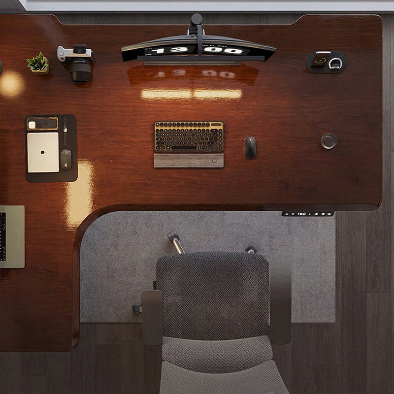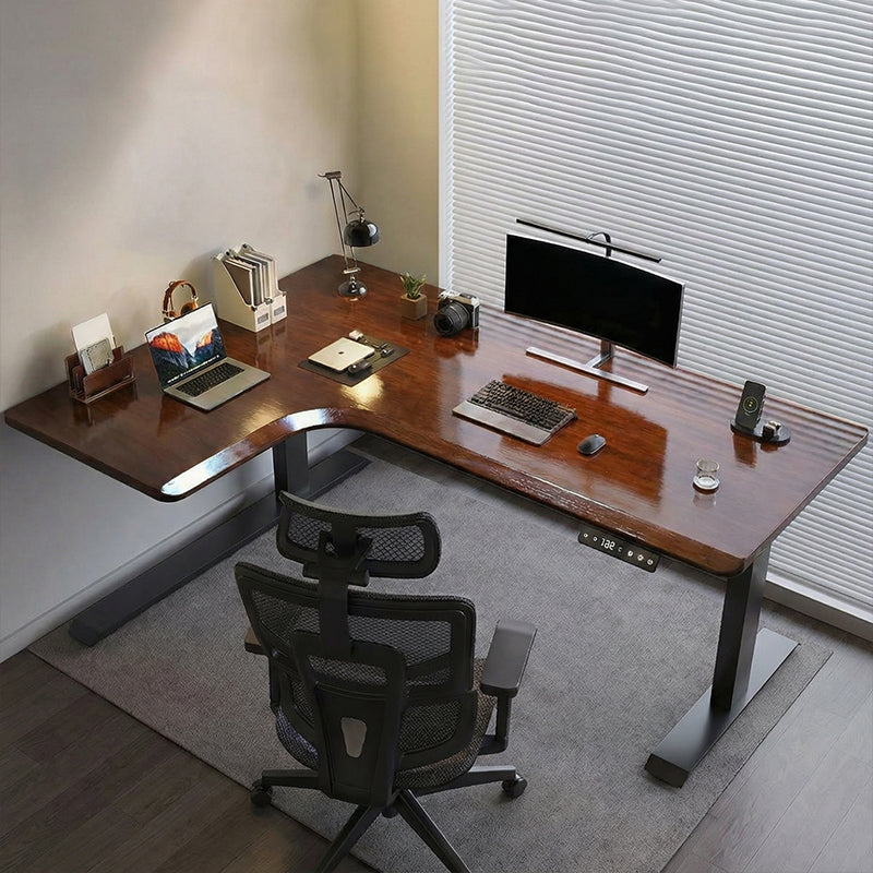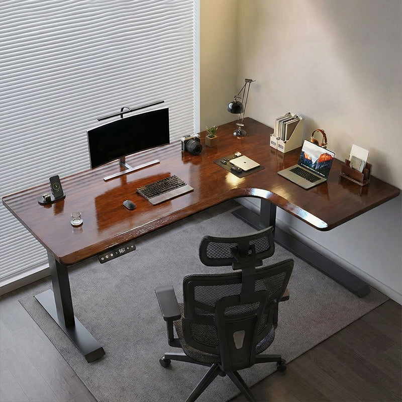 この昇降式デスクは、その高級感あふれるデザインとナチュラルな風合いが特徴です。L字型の設計により、広い作業スペースを提供し、効率的な作業環境を実現します。