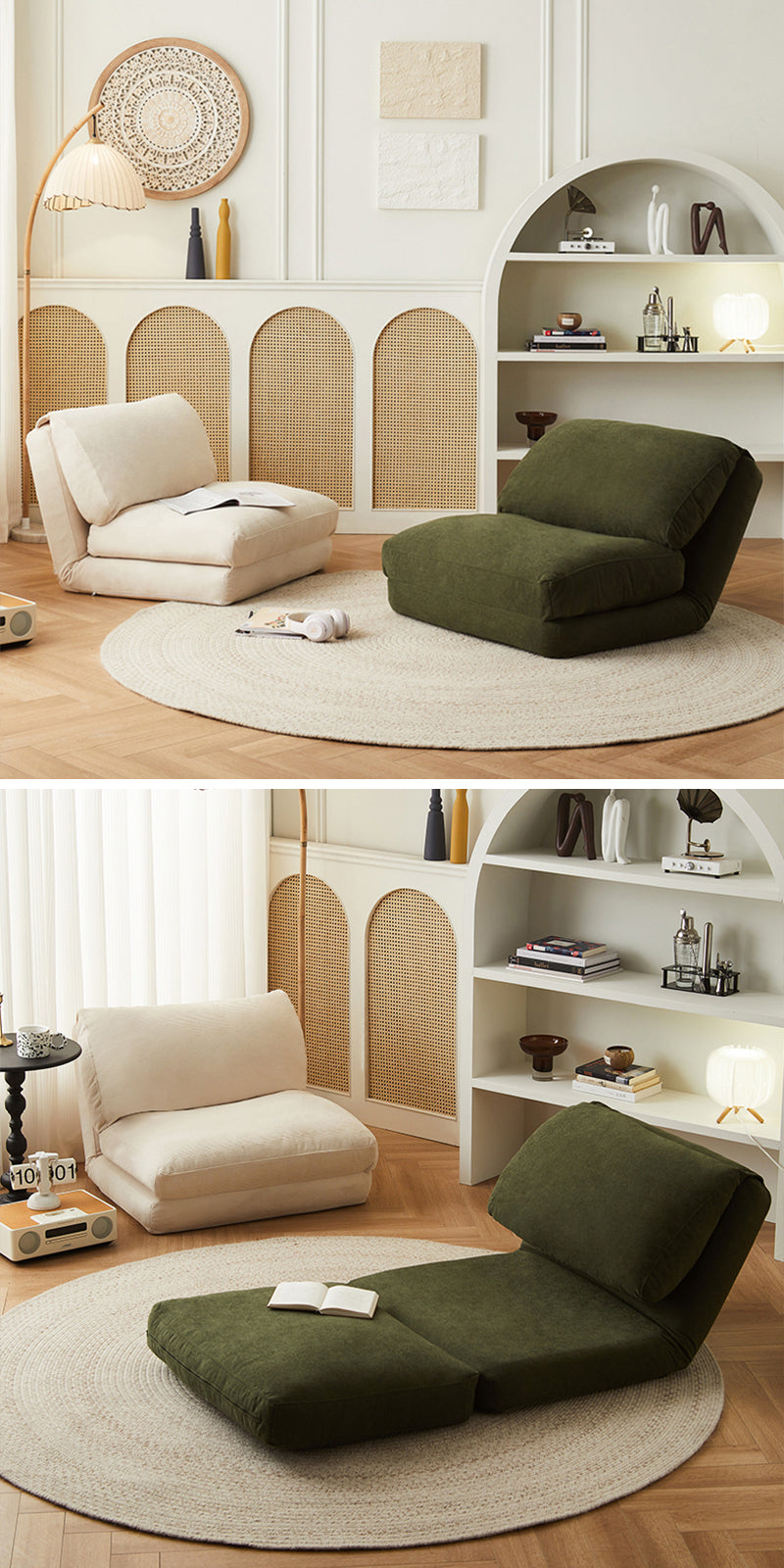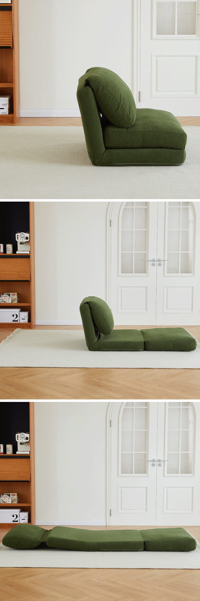ソファ、リクライニングチェア、小さなベッドの3つの機能を一つに統合しています。