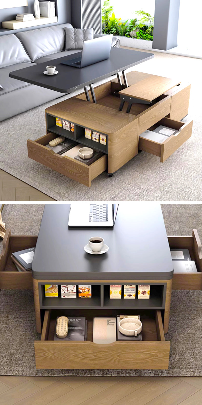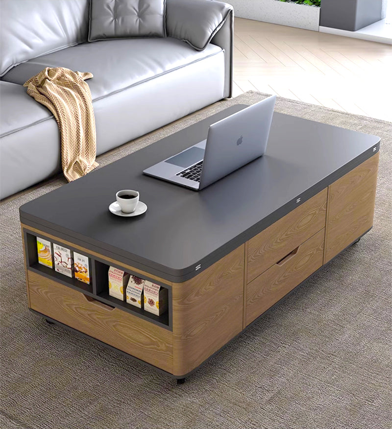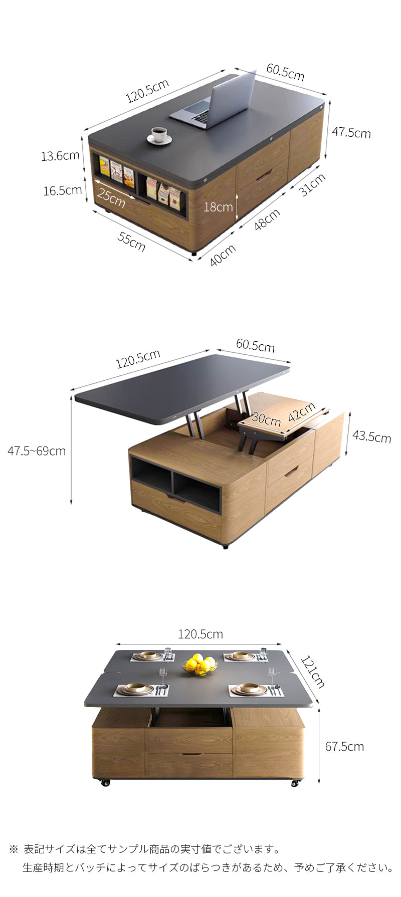 昇降式の機能を持ち、用途に応じて高さを調整できるため、ダイニングテーブルやデスクとしても活用可能です。テーブルの下には収納スペースがあり、引き出しやオープンシェルフを備えているため、小物の整理整頓にも便利です。