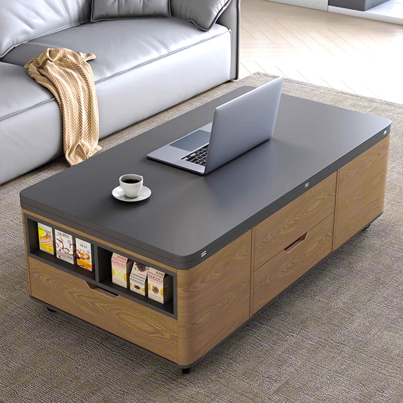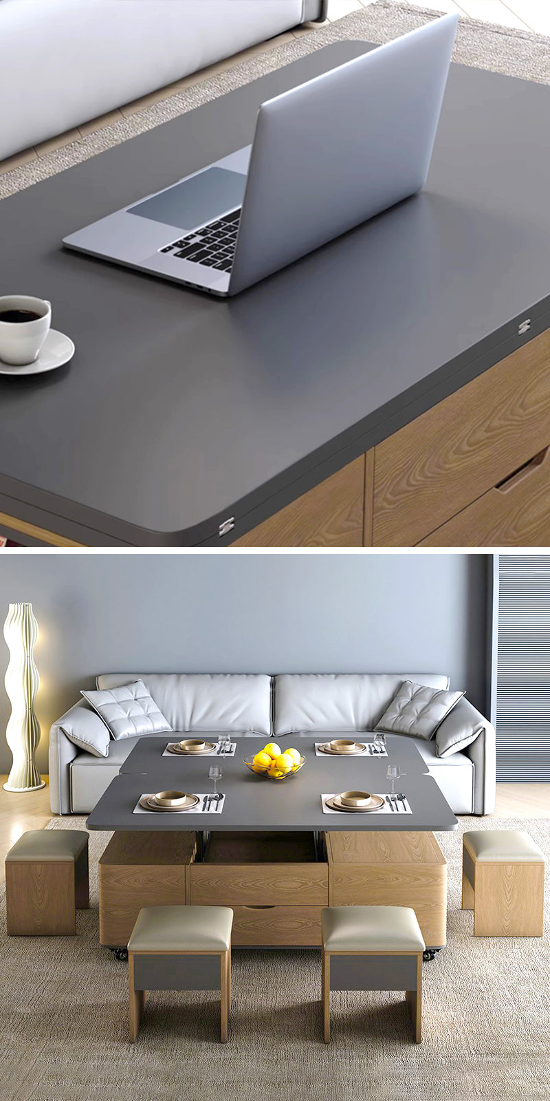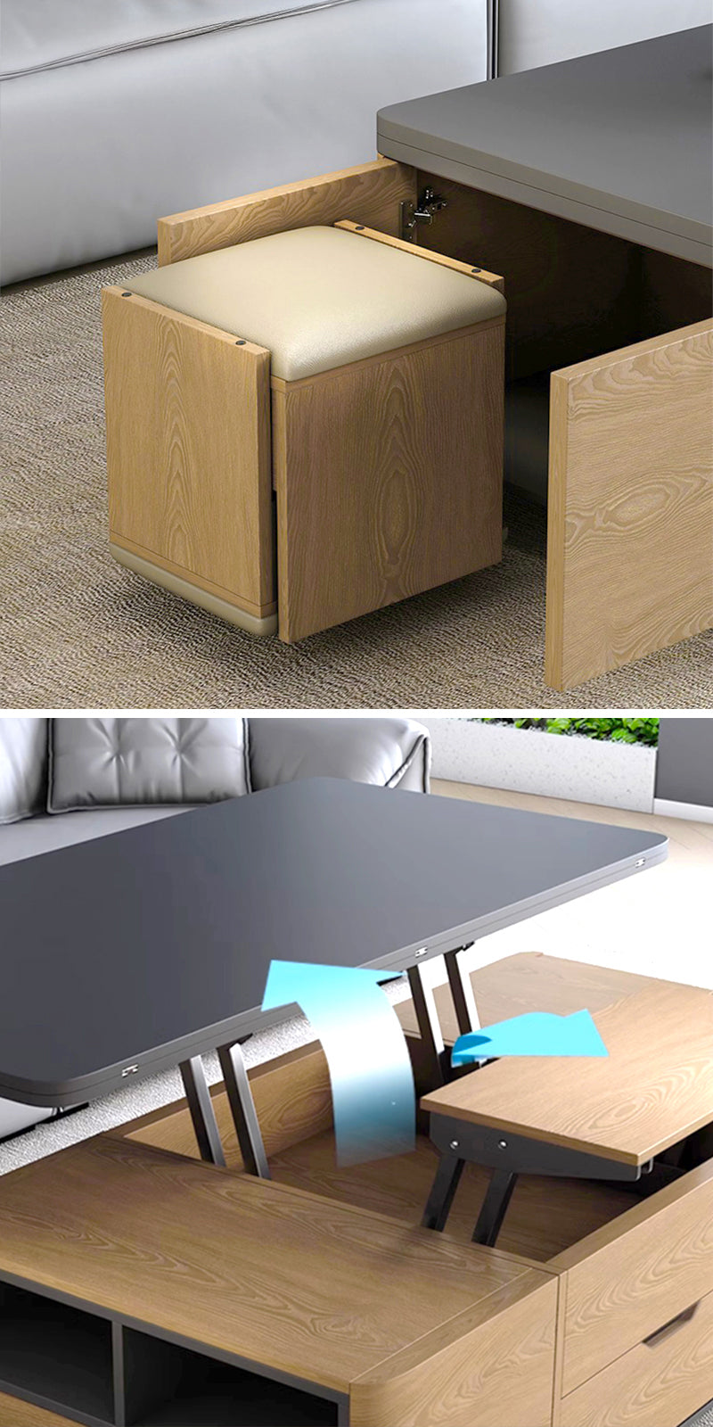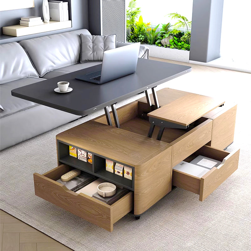 昇降式の機能を持ち、用途に応じて高さを調整できるため、ダイニングテーブルやデスクとしても活用可能です。テーブルの下には収納スペースがあり、引き出しやオープンシェルフを備えているため、小物の整理整頓にも便利です。